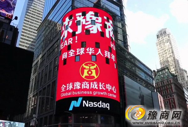 美国时间2月8日上午,正是农历的中国小年,纽约时代广场,备受全球瞩目的纳斯达克圆柱形电子显示屏上,“全球豫商成长中心向全球华人拜年,欢迎全球豫商回家过年”的中英文白色大字和以司母戊鼎、商币、洛书和大象为元素构成的黄色巨人LO,于“故宫红”背景的映衬下,格外的引人注目。这是全球豫商成长中心成立后的首次全球亮相,她带着“河南的 中国的 世界的”开放理念,在新年伊始,于全球商业中心,向全球的华人拜年,向分布在世界各地的豫商问好!
