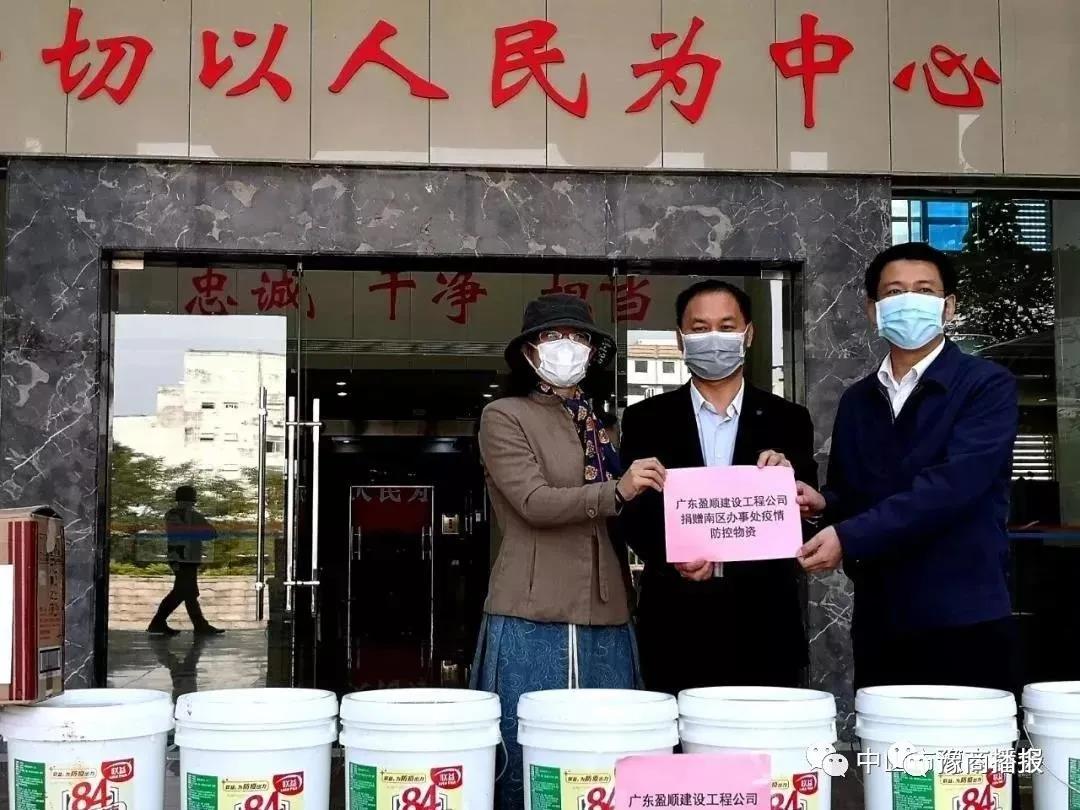 据中山市河南商会介绍,商会副会长单位广东盈顺建设工程有限公司于2月19日,向南区办事处捐赠防疫物资——84消毒液(40斤装)20桶,自喷75度酒精50支?;嵩钡ノ恢猩绞欣ざ锟萍加邢薰居?月19日向中山火炬开发区医院捐赠84消毒液10桶,于2月20日向中山市人民医院南朗分院捐赠84消毒液10桶。
