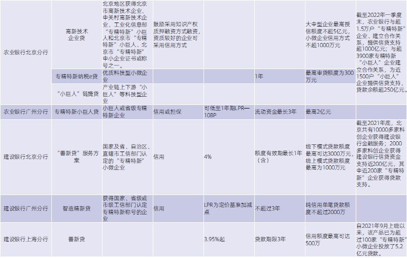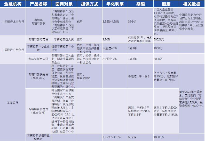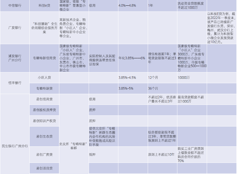 统一面向各梯度“专精特新”中小企业的产品占比38%,面向“小巨人”及以上级别企业的专属产品占比12%,另,中国银行广州分行“专精特新培育贷”面向列入广州市工信局小升规培育库名单企业,民生银行广州分行的8款产品面向北交所“专精特新”客群; -