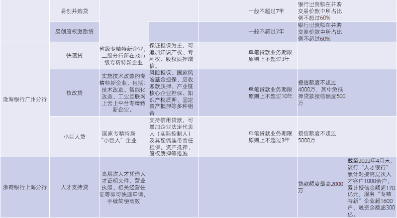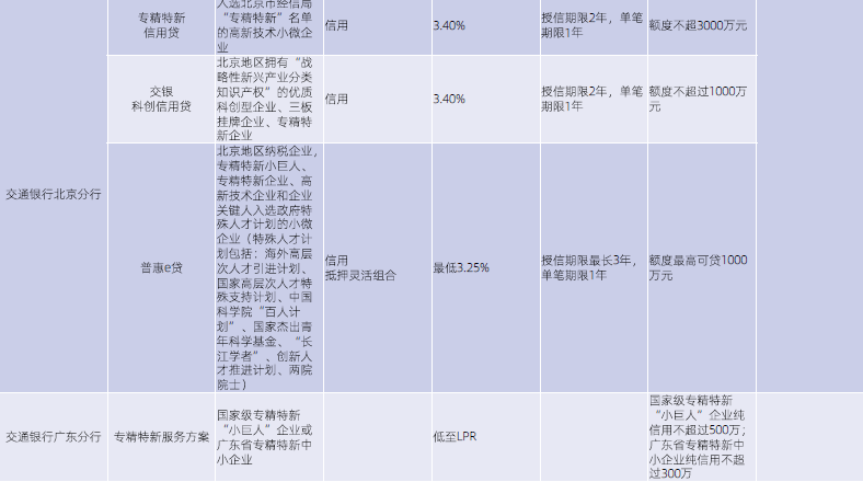 52%的产品授信期限在1到3年之间,12%的产品不超过1年,用于购置厂房及设备、技术改造等类型的产品期限较长,可达5到10年,如工商银行北京分行“专精特新设备购置绿色贷”、民生银行“易创厂房贷”、中国银行广州分行“专精特新培育贷”、渤海银行广州分行“技改贷”等; -