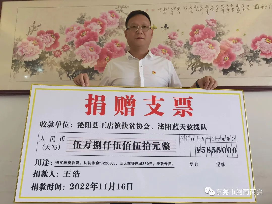 近日,河南疫情反复,形势牵动人心!11月16日,东莞市河南商会名誉会长、驻马店泌阳籍爱心企业家王浩积极助力河南老家疫情防控,向河南老家捐赠医用口罩50000个、防护服500套、医用外科手套2000双、酒精200瓶等一批抗疫物资,同时还向泌阳蓝天救援队捐助6350元,合计58550元。王浩名誉会长作为东莞优秀的豫商爱心企业家代表,他以捐赠防疫物资等的方式,参与家乡抗击疫情,以实际行动展现企业家的社会责任和使命担当,同时,他也希望通过爱心行为号召更多的社会各界人士凝聚共识、汇聚力量,齐心协力,为家乡打赢这场疫情防控歼灭战贡献更大的力量!