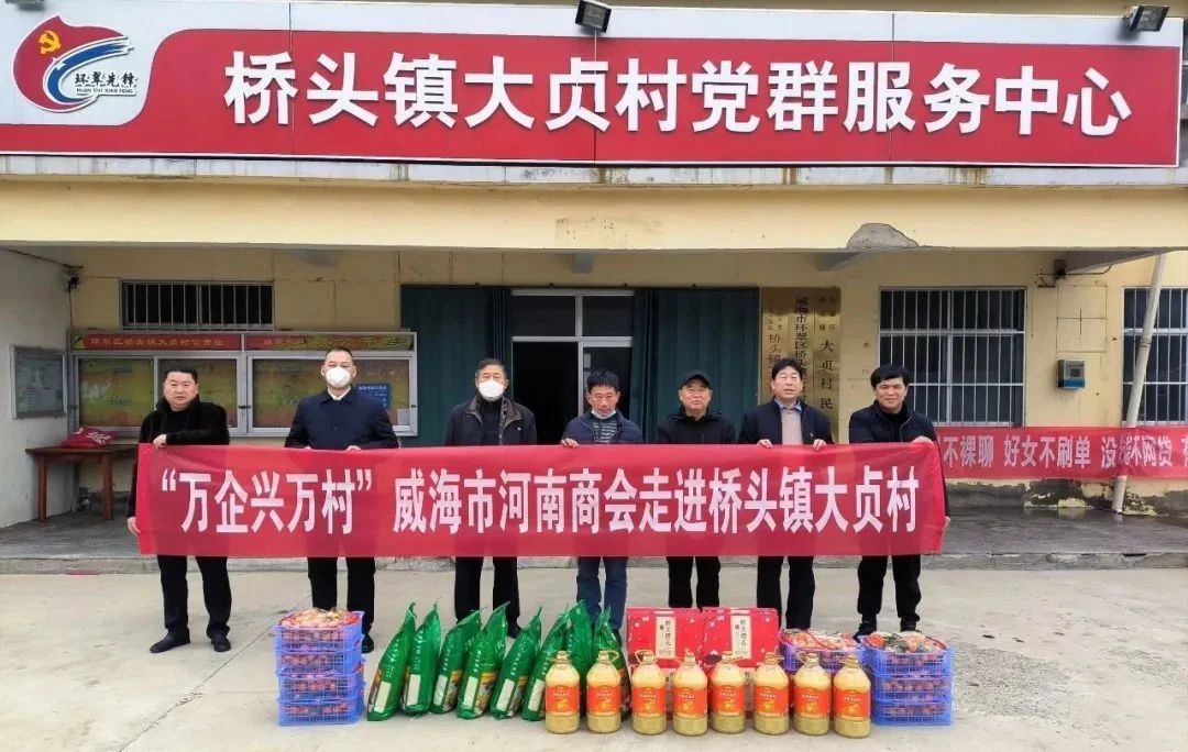 2023年1月12日,新春佳节来临之际,威海市河南商会党支部走进桥头镇大贞村开展“万企兴万村”主题党日活动,为八户在党五十年老党员、困难群众送去了大米、花生油、水果、生活用品等慰问品。