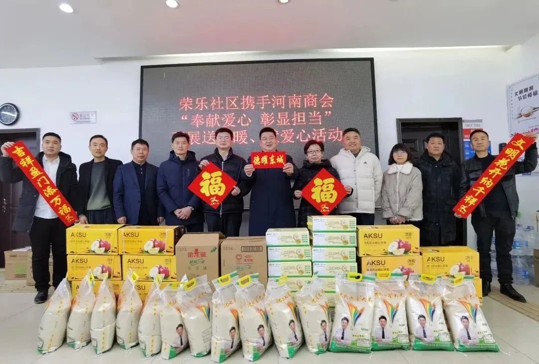 2023年1月13日,辽宁省河南商会会长杨耀文带领商会一行走访慰问大东区津桥街道荣乐社区的困难群众、老党员、退伍军人及一线工作人员。为荣乐社区15户特殊群体送去关怀与温暖,捐赠米、油、苹果、牛奶等爱心物资并致以诚挚的新春祝福,让他们感受党和政府的温暖,商会企业家们的关爱。