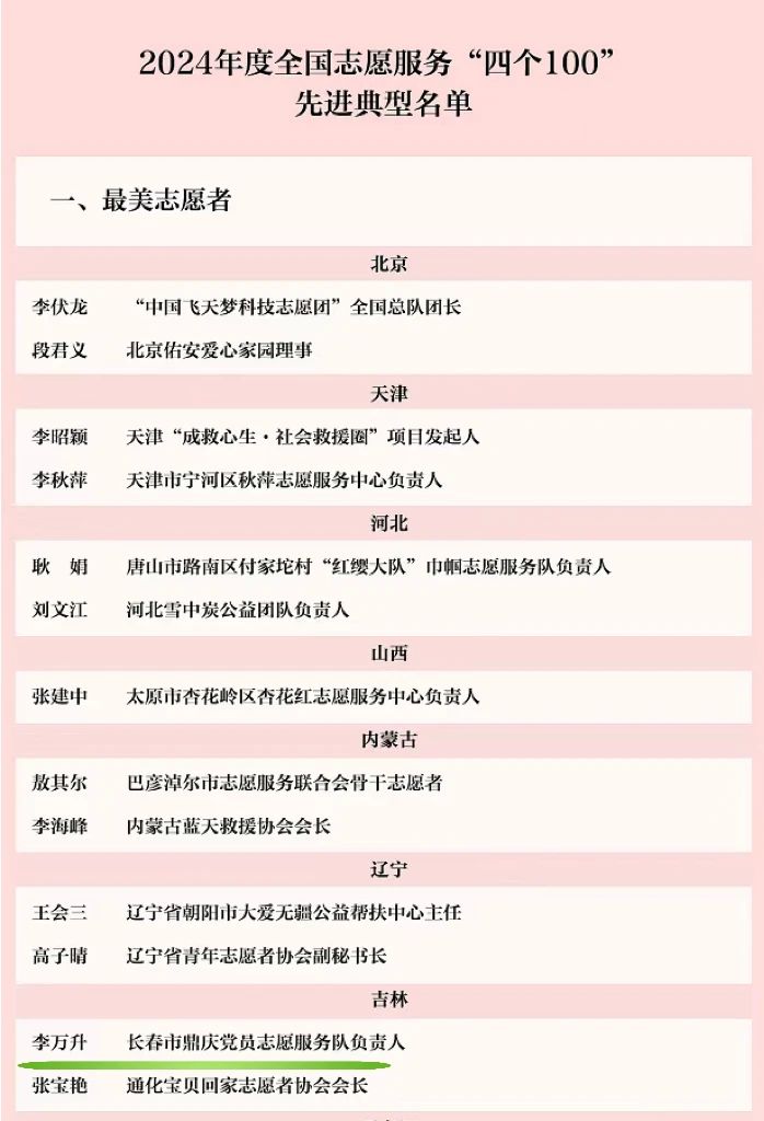 近日,2024年度全国志愿服务“四个100”先进典型揭晓,河南省豫商联合会常务理事、吉林省河南商会会长、长春市鼎庆公司董事长李万升荣获“最美志愿者”称号。该评选由中央社会工作部等22个部门和单位联合开展,旨在表彰在志愿服务领域有突出贡献的个人和组织。