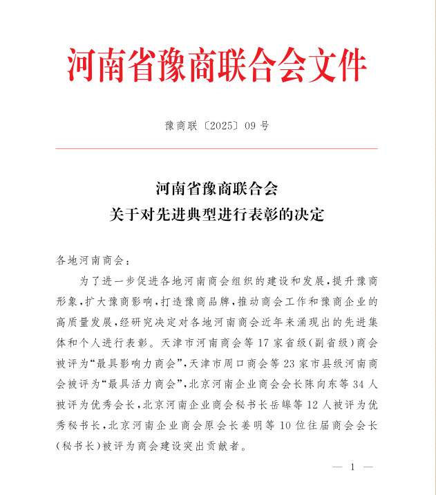 河南省豫商联合会关于对先进典型进行表彰的决定